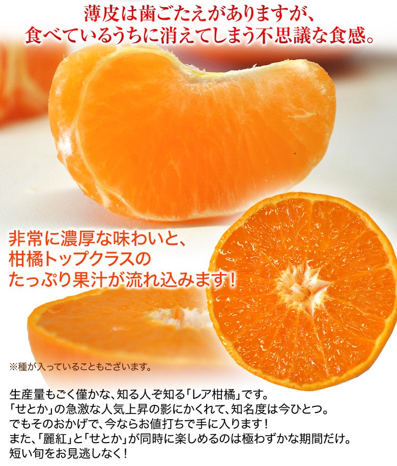 「せとか」に比べて生産量が少なく知名度がまだまだですが、負けず劣らずの味わいです。内皮は薄いため口に残ることなく、爽やかで甘いたっぷりの果汁が口いっぱいに広がります。