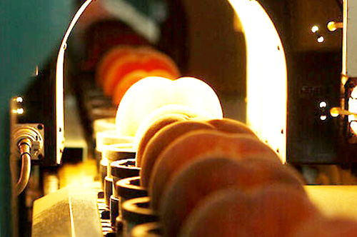 収穫された桃は、1玉1玉お皿にのせられ、ベルトコンベアで検査されます。検品されて、産地箱に入るまで、一切人の手に触れません。糖度検査、重さ、色合い、すべてあらゆる方向からセンサーが入ります。他の選果場で秀品扱いであっても、春日居統一共選所で あれば、その下の扱いになってしまうほどです。下手な桃を持ち込むと没収されてしまうのですから、相当の自信がないと春日居統一共選所に桃を持ち込めないのです。