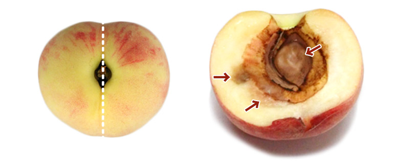 画像のような種が割れた果実も入る可能性がございます。果肉が肥大する時期に起きる、生理障害の一種ですが食味には問題ありません。