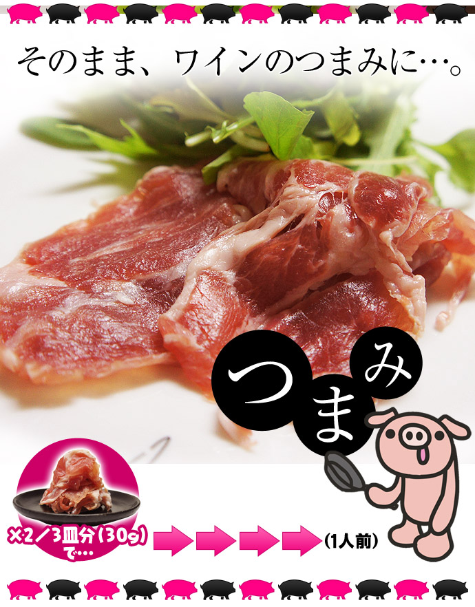 | 原材料/素材/材質 | 豚もも肉(輸入)、食塩、砂糖、香辛料/調味料(アミノ酸)、酸化防止剤(ビタミンC)、発色剤(亜硫酸Na)、(一部に豚肉を含む) 【加工地】国内 |