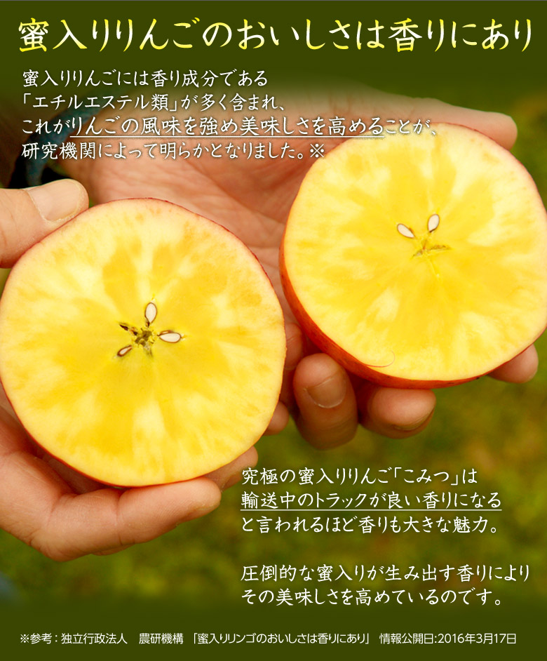 ※蜜入りの度合いには個体差があります。また、貯蔵により蜜は徐々に果肉に吸収されるため、特に年明けは蜜入りの状態が落ち着きます。