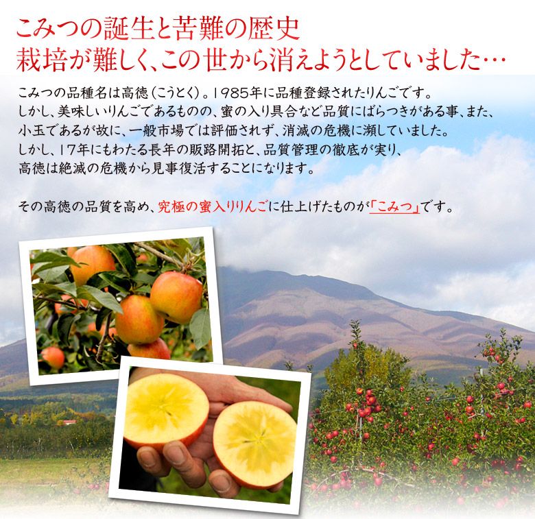『こみつ』はJA津軽みらいこみつ部会が、品種「高徳」の中から厳格な基準を満たしたものだけに名を冠することを許されたブランドです。蜜の入り具合や果実の形状、果皮の美しさなどを総合的に選果し、一定水準を超えた果実のみが『こみつ』と呼ばれます。さらにその中でも、外観の美しさに優れるものが「特選」に格付けされます。