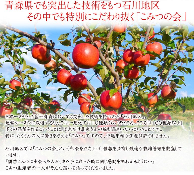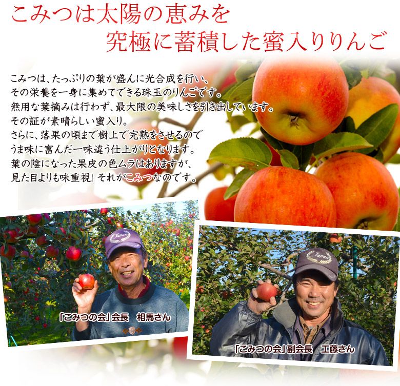 収穫されたリンゴは『こみつ』を名乗る為に、厳しくチェックされます。小玉で蜜がたっぷり入った美味なものだけが『こみつ』を名乗れます。つまり、 究極レベルに達していないりんごは『こみつ』を名乗ることができません。樹上で完熟させる間に、落果と鳥の食害が避けられないので、味を極める為に収穫量はどうしても少なくなります。『こみつ』は究極の蜜入りりんごなのです。