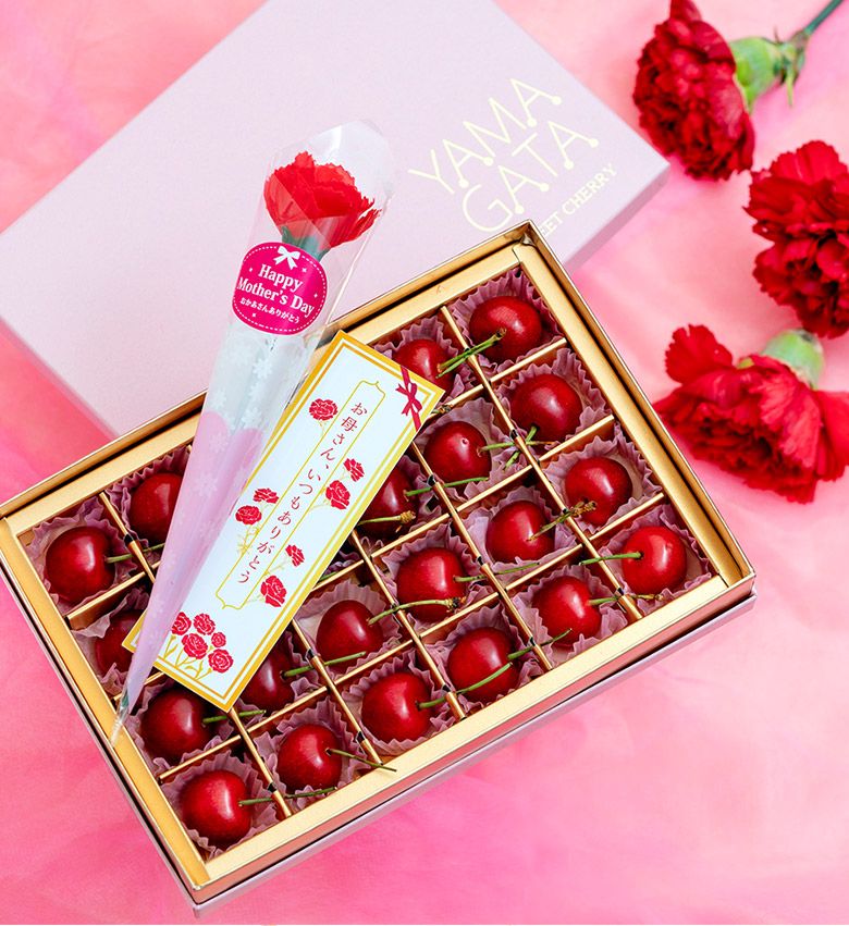 【5/3から順次出荷】 母の日ギフト 山形県産温室さくらんぼ 佐藤錦 Lサイズ 秀品 24粒入(約150g) 化粧箱 ※常温 カーネーション(造花)・メッセージカード付 産地直送