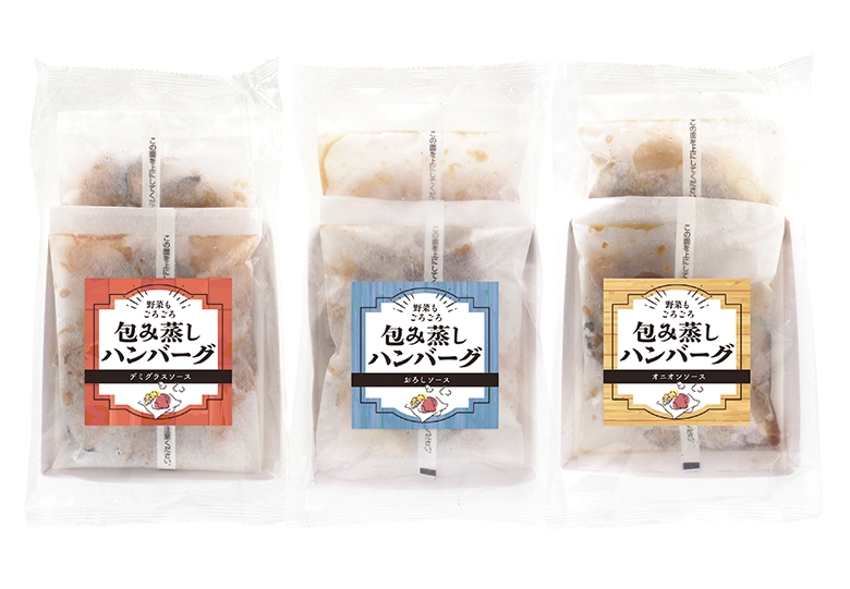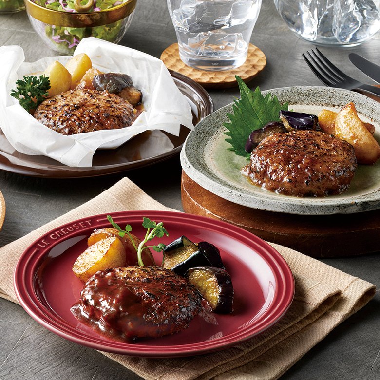 直火焼きしたハンバーグを、ポテトと揚げなすとともに紙で包みました。冷凍のまま電子レンジで温めるだけで手軽に包み蒸しハンバーグが出来上がります。定番のデミグラス、おろし、オニオンの3種のソースでお届けします。
