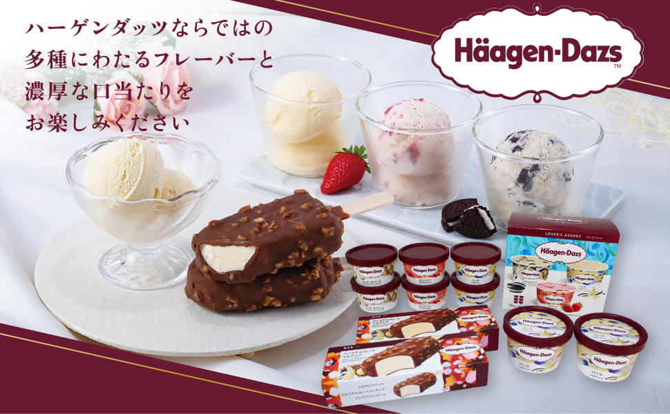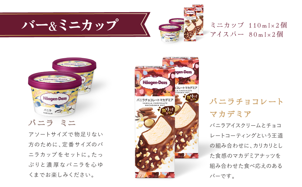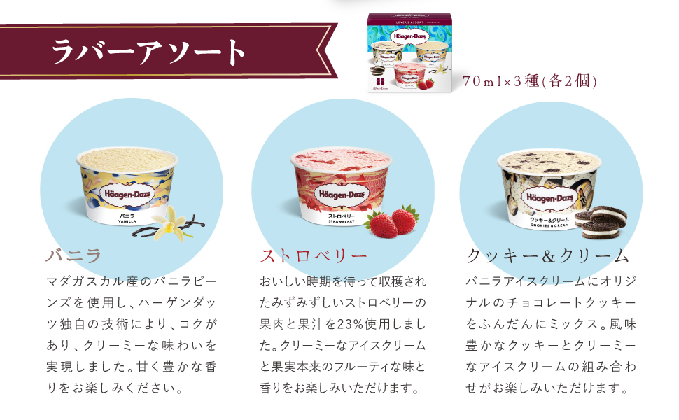| 内容量 | ミニカップ(バニラ)110ml×2個、バー(バニラチョコレートマカデミア)80ml×2本、ラバーズアソート(バニラ・ストロベリー・クッキー&クリーム各70ml×2)×1 |