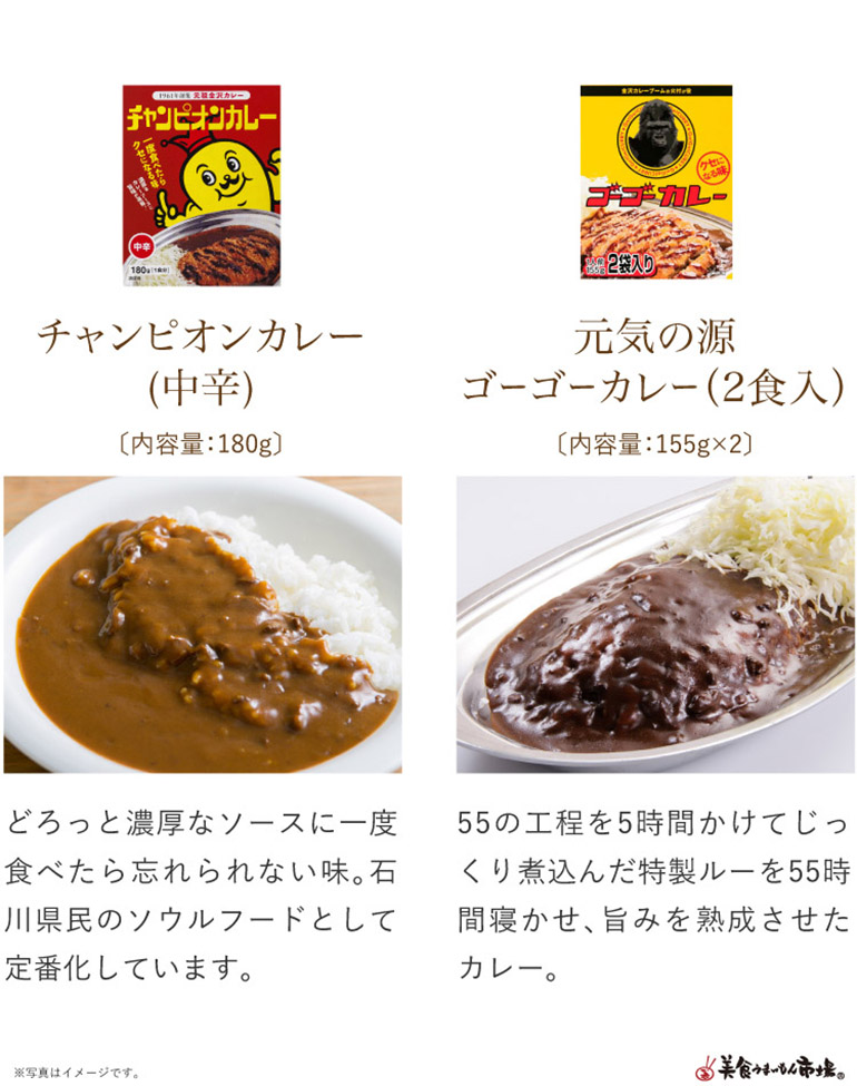 | 内容量 | チャンピオンカレー(中辛) 180g、元気の源ゴーゴーカレー(2食入) 155gX2 |