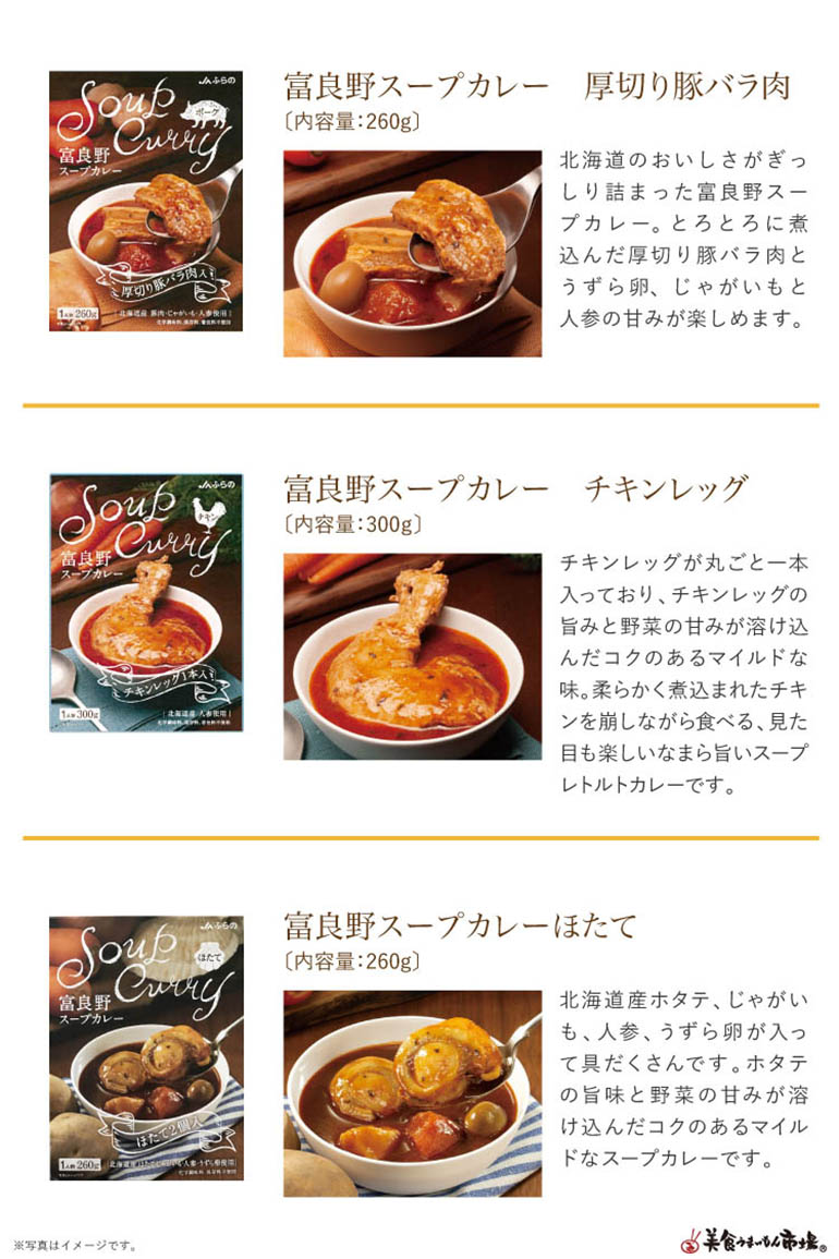 | 内容量 | 富良野スープカレー チキンレッグ 300g、富良野スープカレーほたて 260g、富良野スープカレーえび出汁チキン 260g |