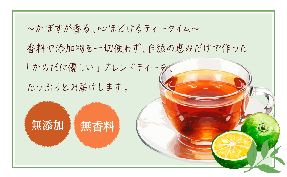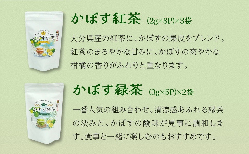 | 内容量 | ・かぼす紅茶(2g×8P)× 3袋 ・かぼす緑茶(3g×5P)×2袋 |