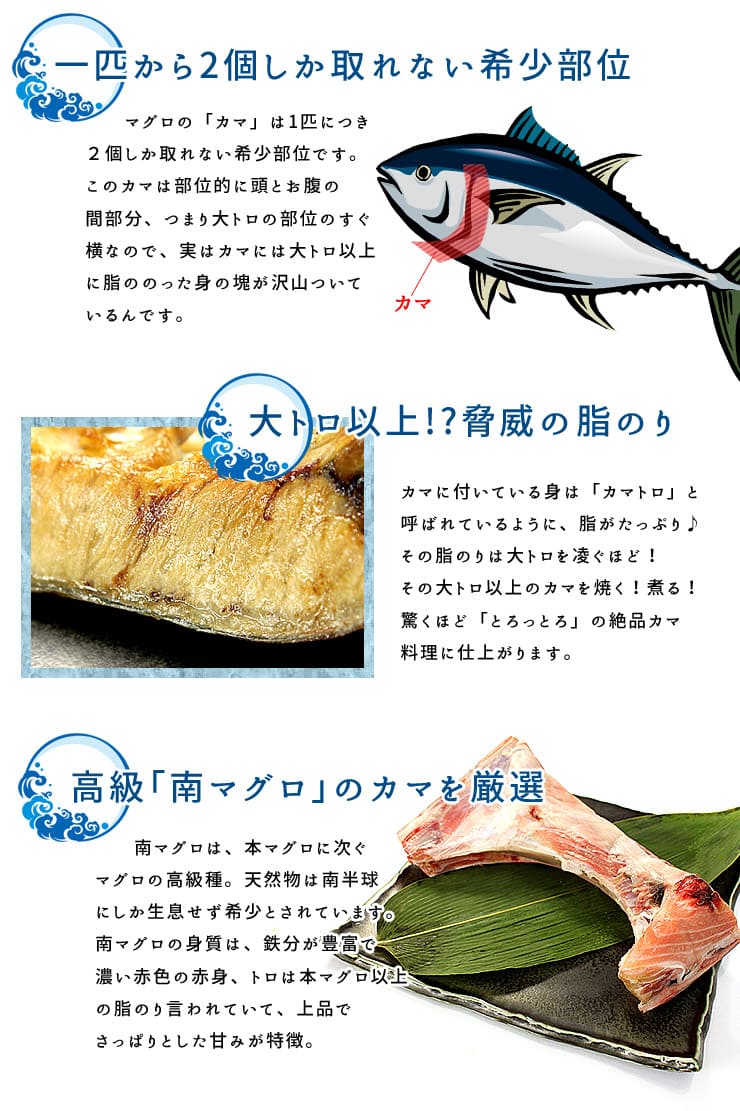 | 注意事項/留意事項 | ●商品は冷凍状態で発送致します。 ●加熱調理でお召し上がりください。 ●皮・骨付きの商品になります。 ●重量は多少(10g程度)前後する場合があります。 ●カットしていないカマのご要望は承れません。 |