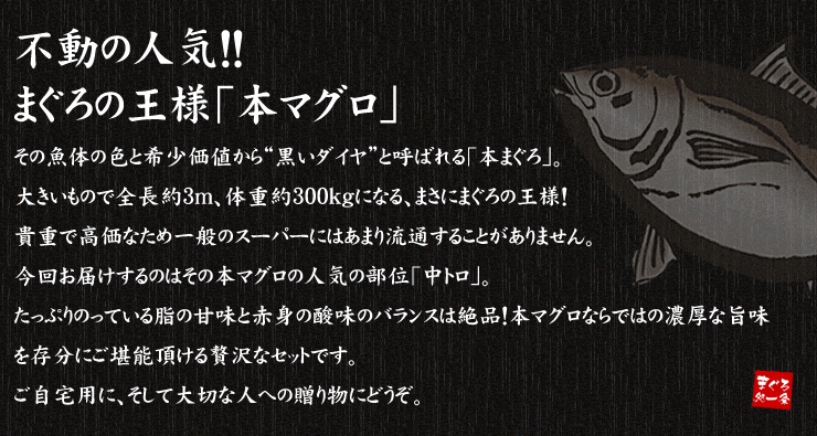 ![本マグロ 極上中トロ 300g 解凍レシピ付 [中トロ300]](http://d3mijdhf1k8u77.cloudfront.net/img/goods/1/AA0312-10000386-P.jpg?12009)