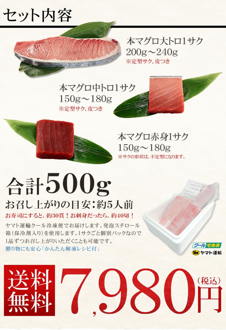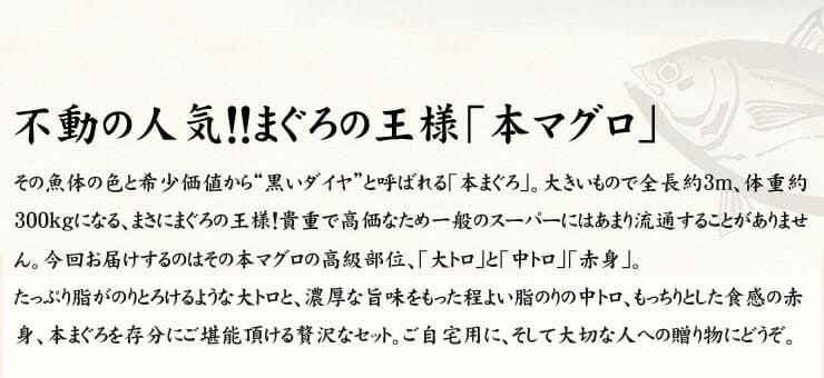 | 内容量 | 大トロ200g、中トロ150g、赤身150g |