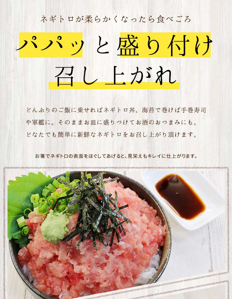 ![天然マグロの粗挽きネギトロ200g 小分け包装 [ネギトロ100g-2p]](http://d3mijdhf1k8u77.cloudfront.net/img/goods/6/AA0312-10001630-P.jpg?120015)