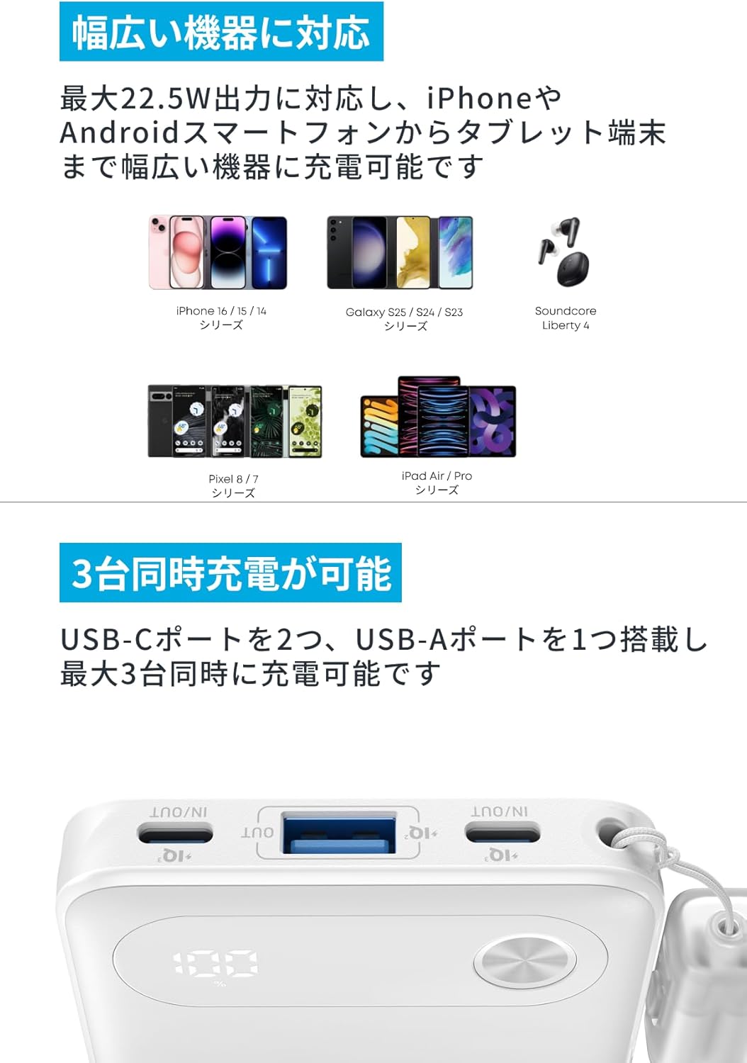 AnkerPowerBank(10000mAh,22.5W)、USB-C&USB-Cケーブル、ストラップ、クイックスタートガイド、カスタマーサポート