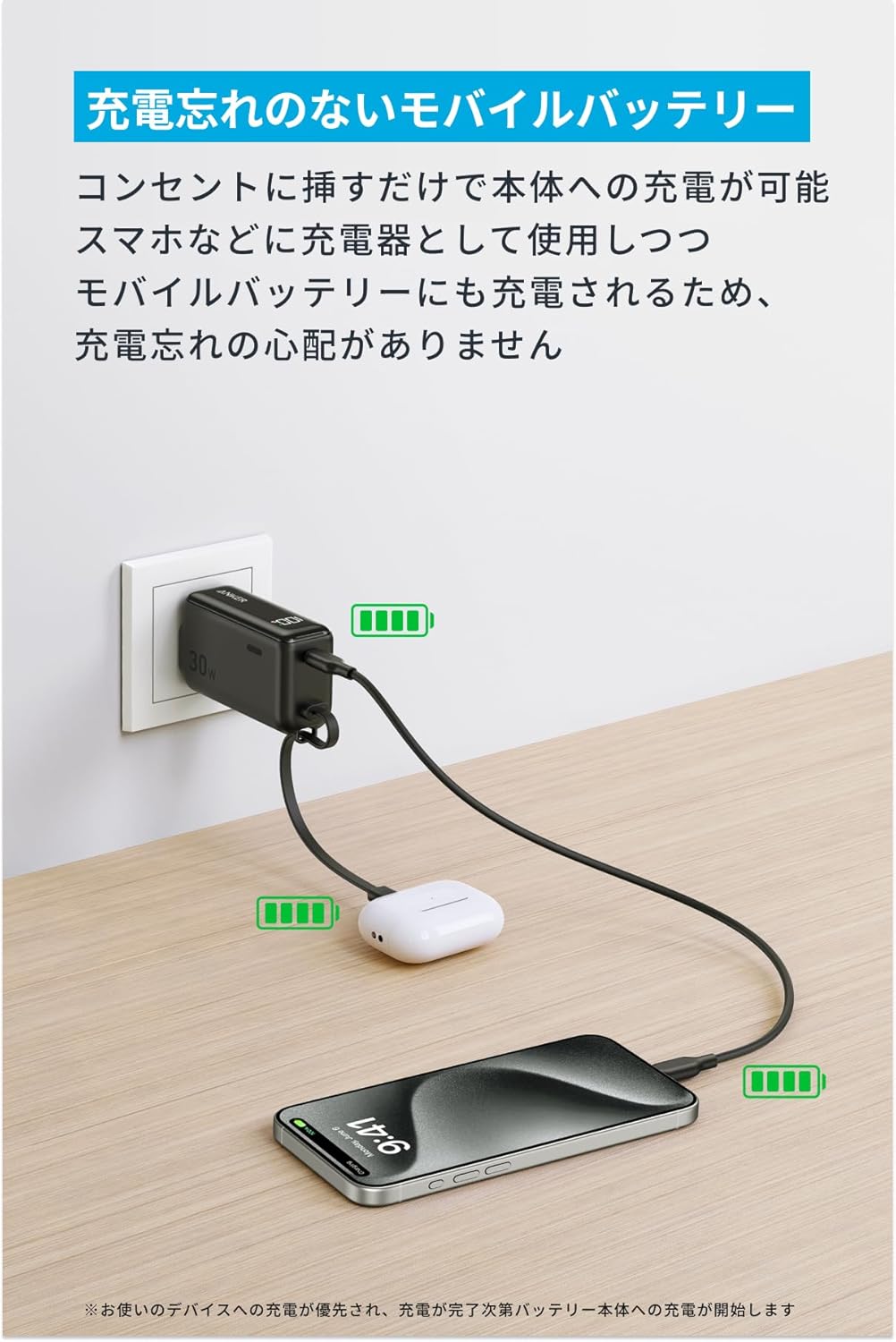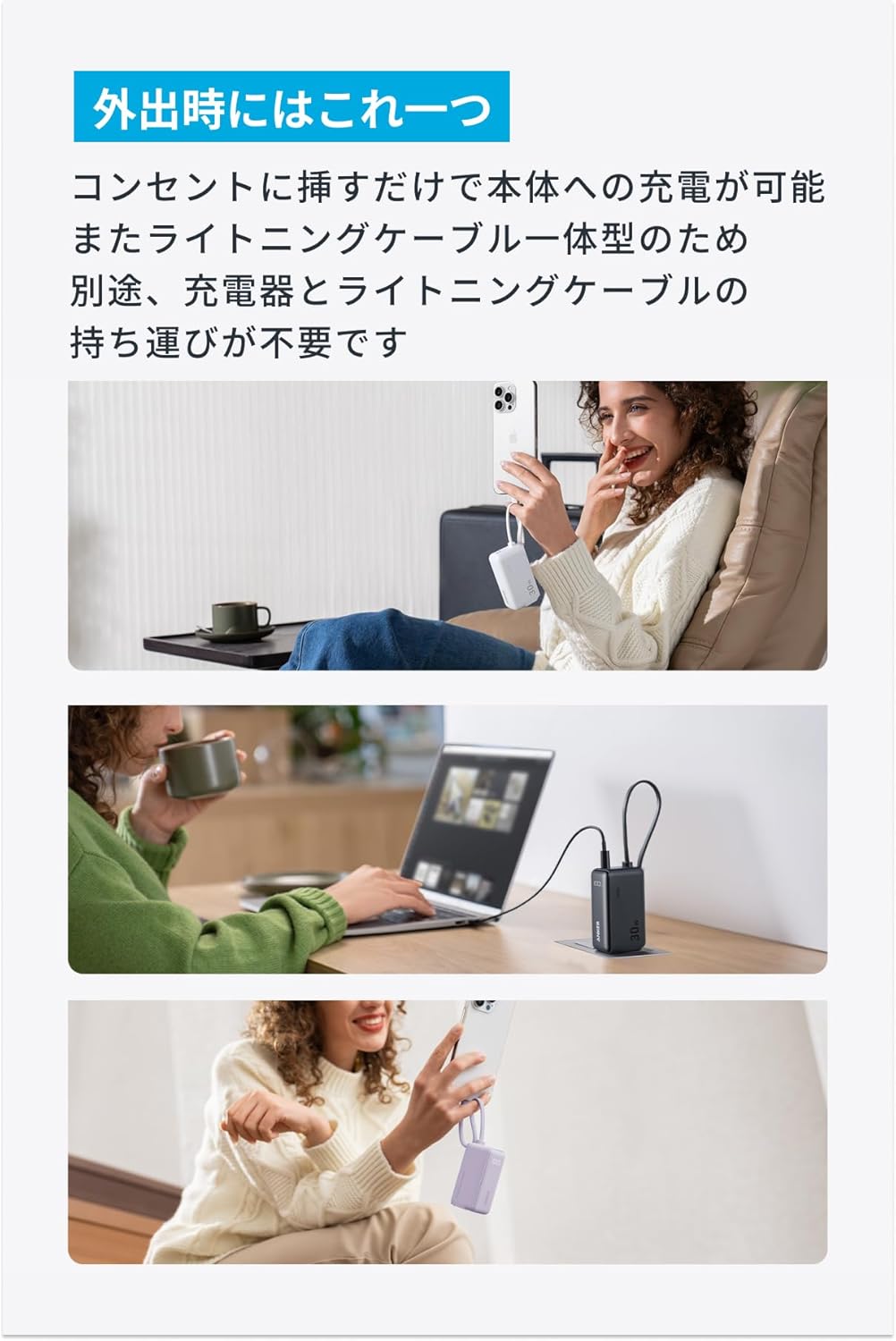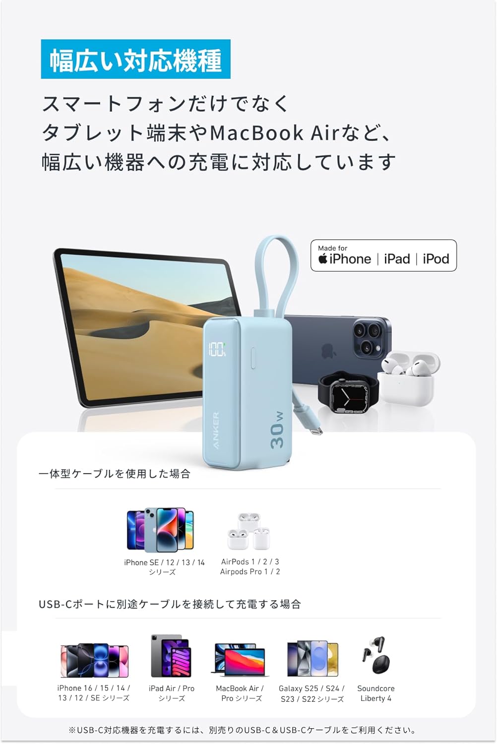 Anker Power Bank (30W, Fusion, Built-In USB-C ケーブル) 、取扱説明書、カスタマーサポート