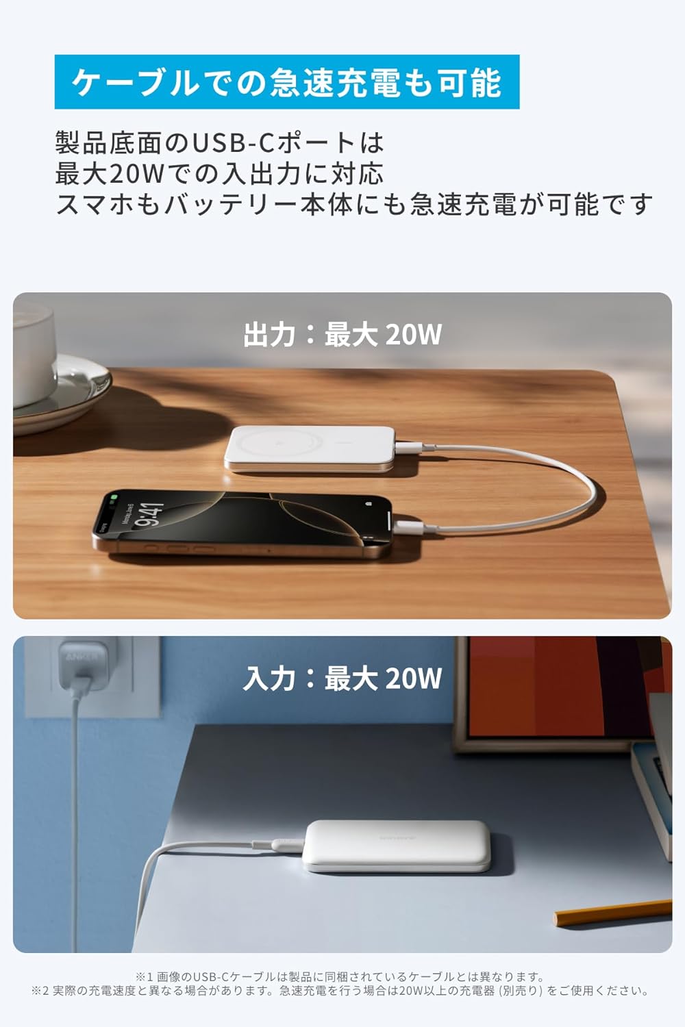 AnkerNanoPowerBank(5000mAh,MagGo,Slim)、USB-C&USB-Cケーブル(0.6m)、取扱説明書、カスタマサポート