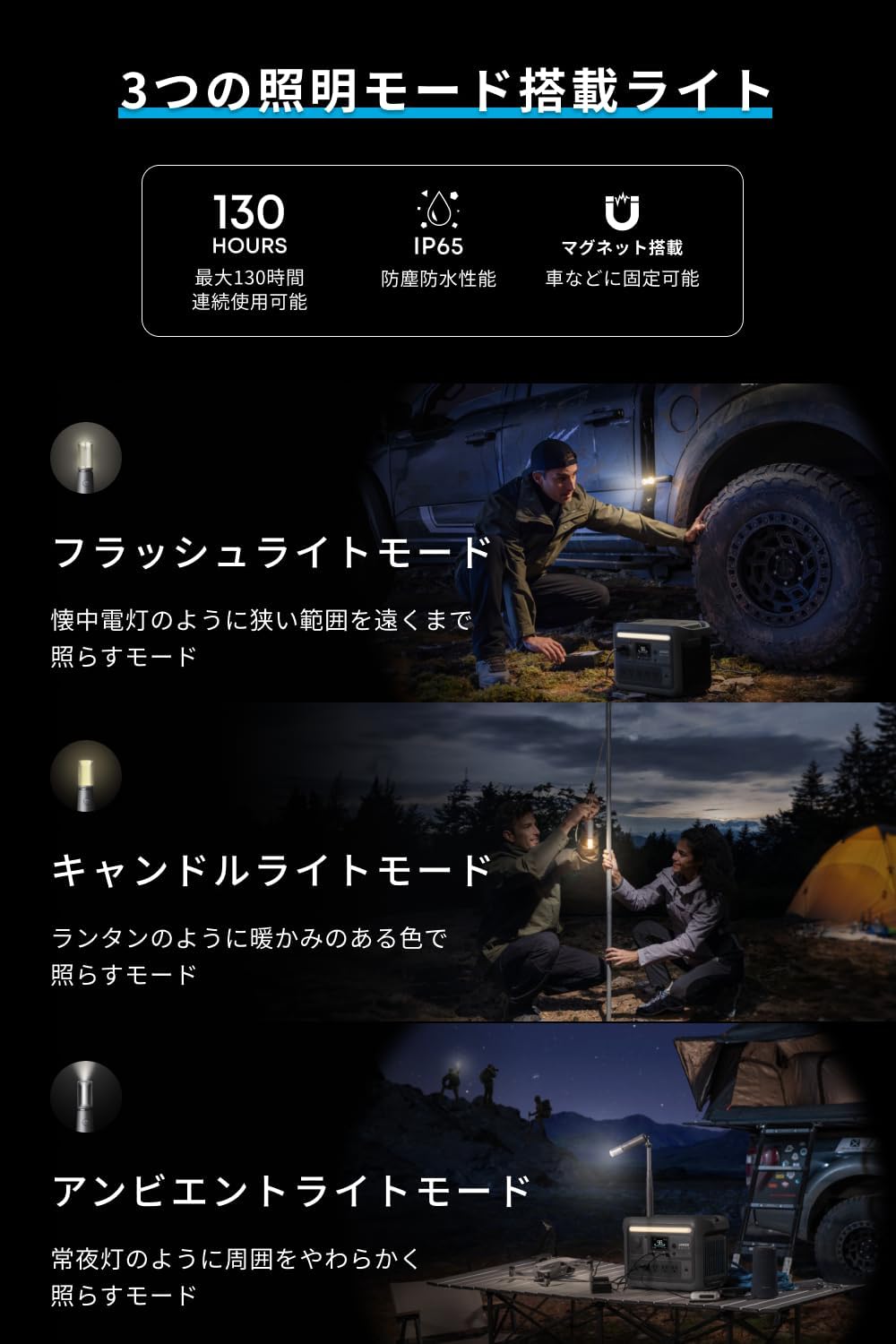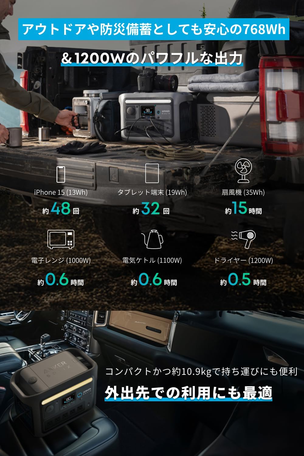 パッケージ内容:製品本体、AC充電ケーブル、シガーソケット充電ケーブル、安全マニュアル、カスタマーサポート