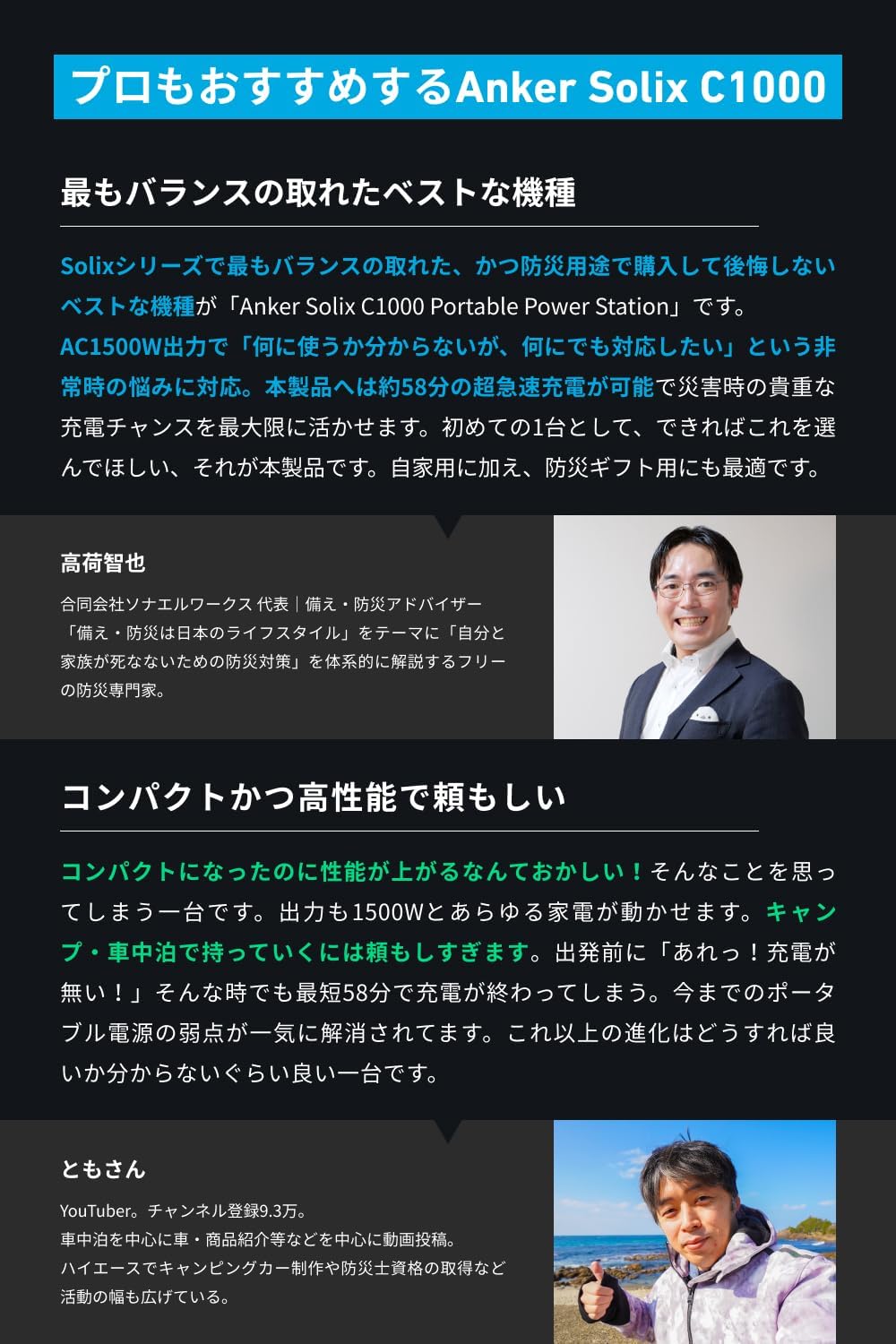 パッケージ内容:製品本体、AC充電ケーブル、シガーソケット充電ケーブル、安全マニュアル、カスタマーサポート