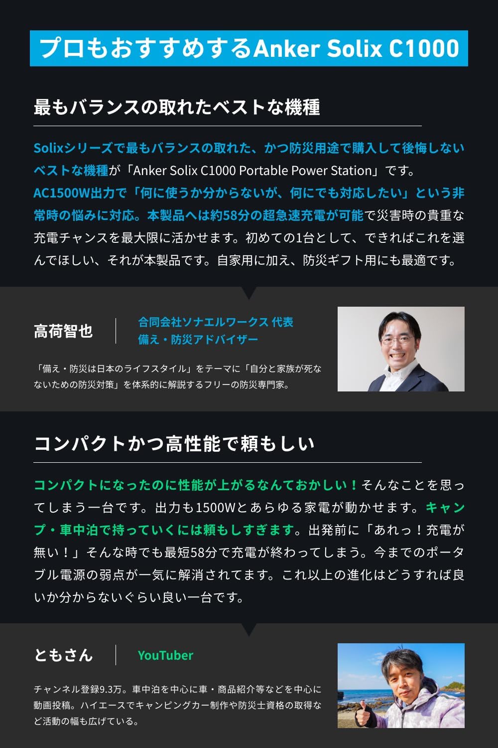パッケージ内容:製品本体、AC充電ケーブル、シガーソケット充電ケーブル、安全マニュアル、カスタマーサポート