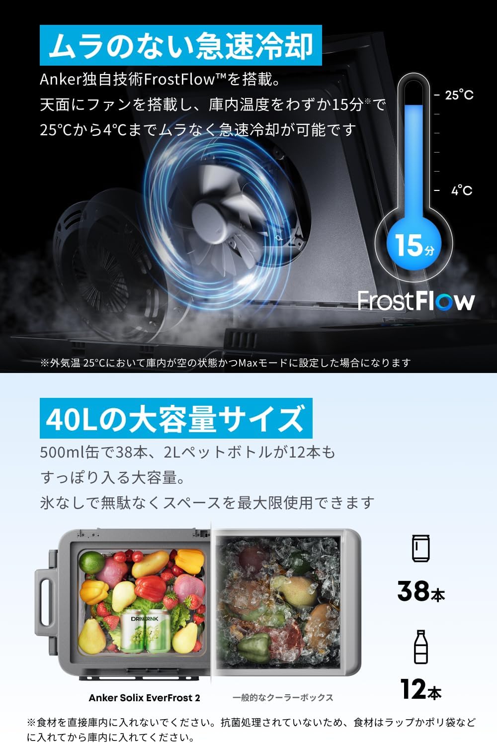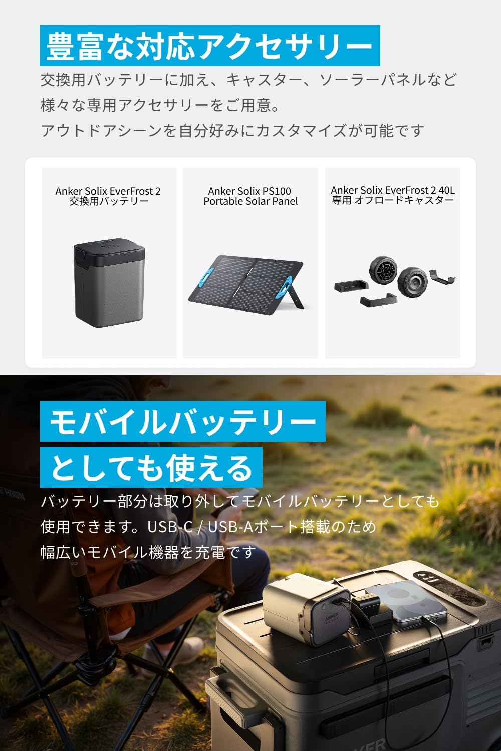 AnkerSolixEverfrost240LElectricCooler、取り外し可能バッテリー、AC充電ケーブル、シガーソケット充電ケーブル、ストッパー(x2)、バッテリーケース引き出し、安全マニュアル、クイックスタートガイド