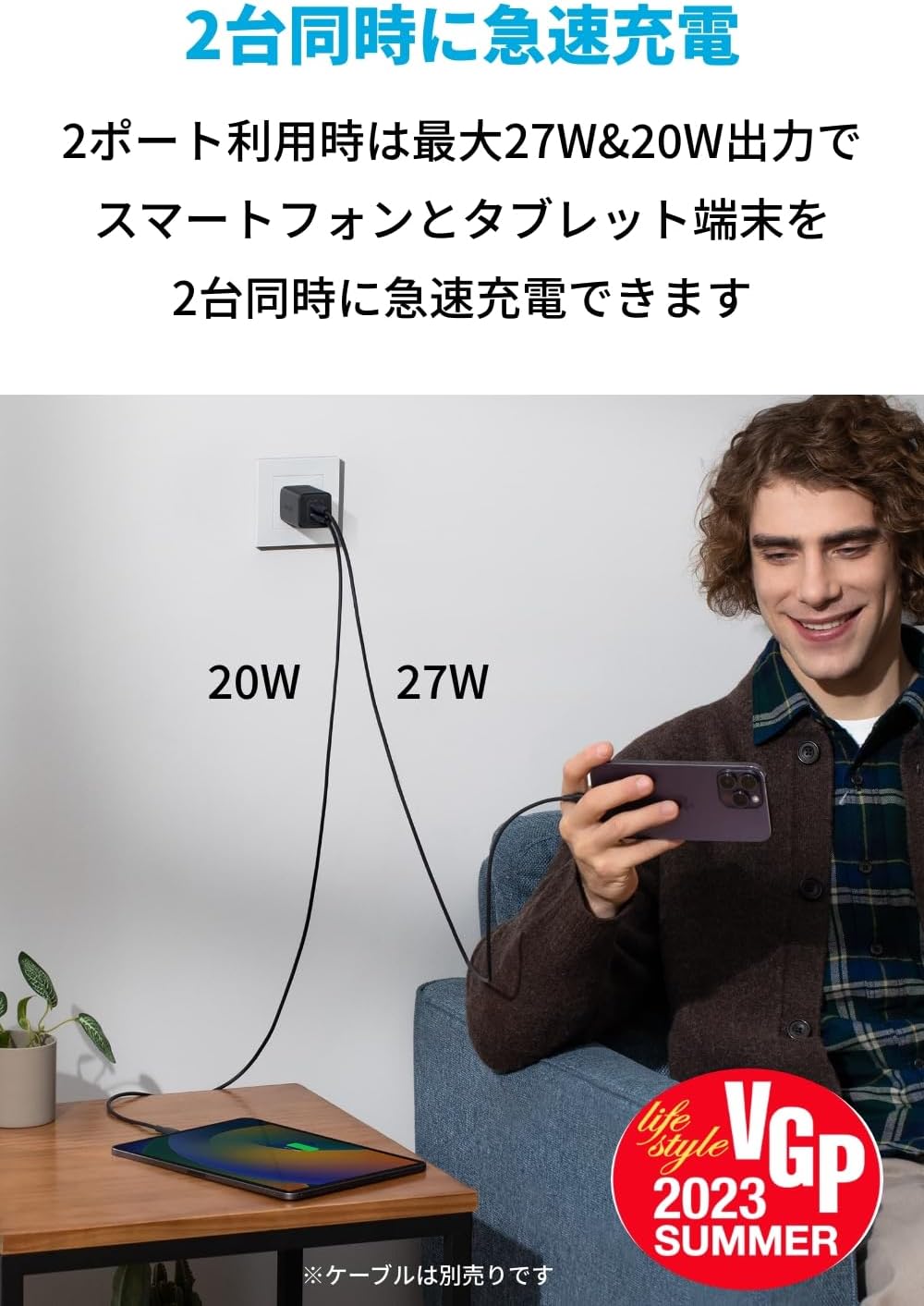 Anker523Charger(Nano3,47W)、取扱説明書、最大24ヶ月保証(※正規販売店からの注文に限り18ヶ月保証の対象となり、条件付きで+6ヶ月の延長保証が付きます。注文番号が保証書の代わりとなります。)、カスタマーサポート
