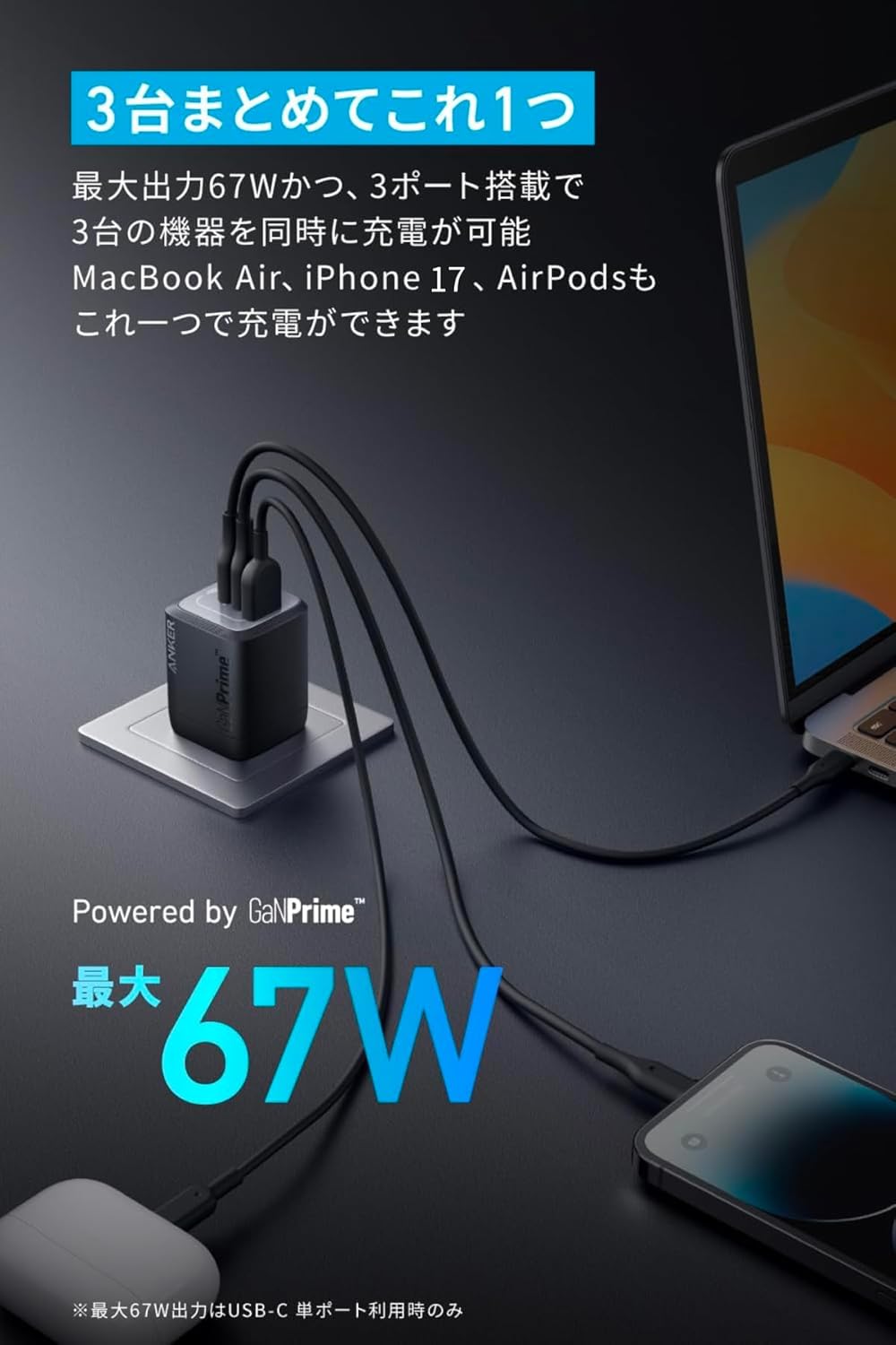 Anker Prime Wall Charger (67W, 3 ports, GaN) ブラック