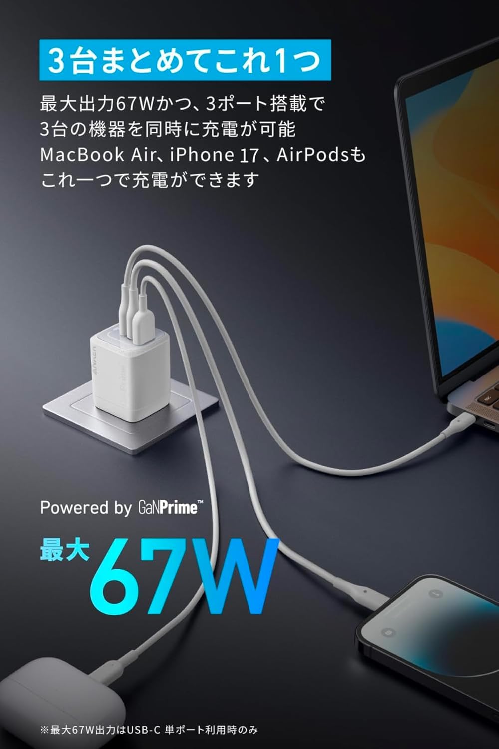 Anker Prime Wall Charger (67W, 3 ports, GaN) ホワイト