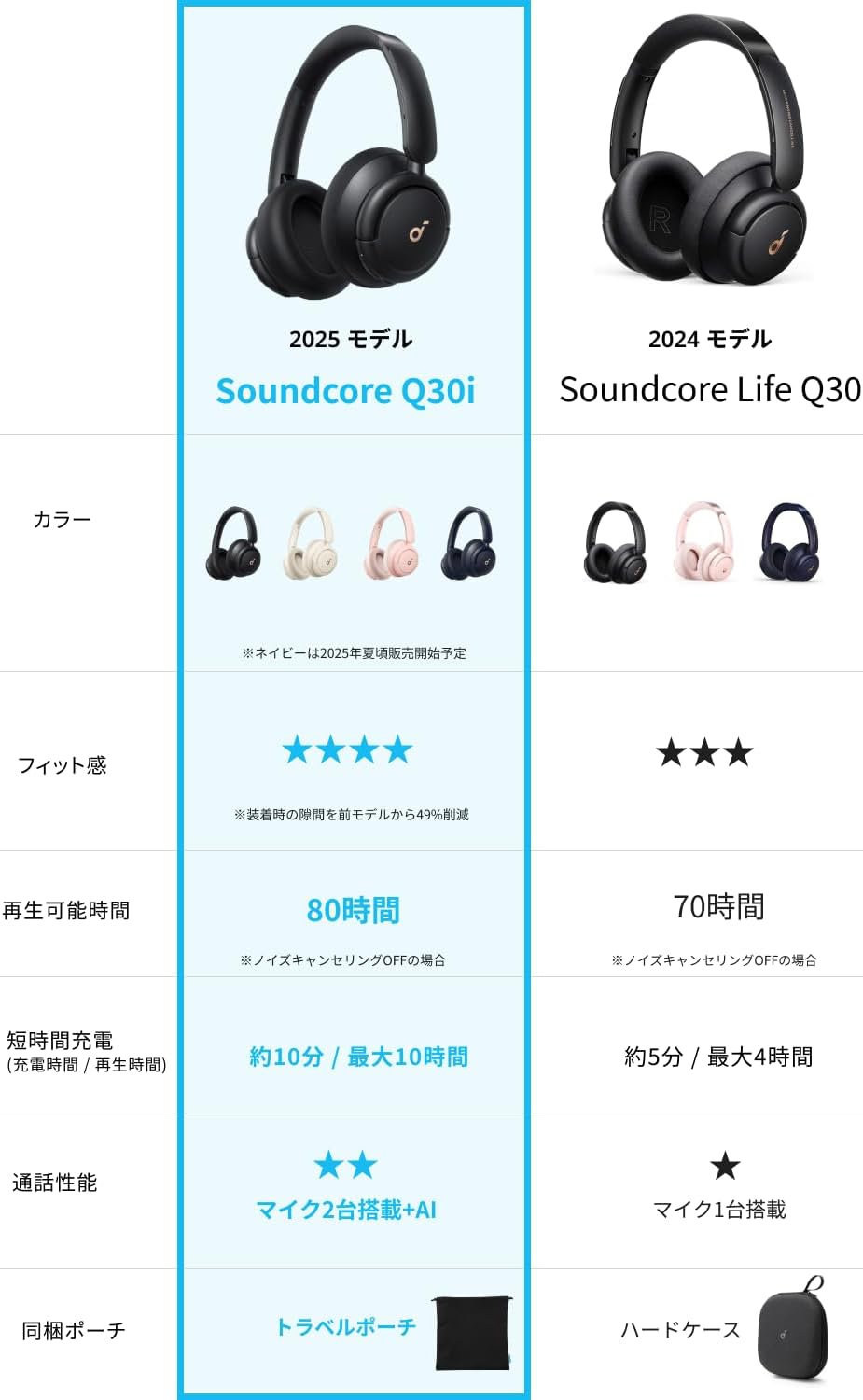 soundcoreQ30i、USB-C&USB-Aケーブル、Auxケーブル、トラベルポーチ、クイックスタートガイド、安全マニュアル、技適マーク認証済み商品(周波数帯:2.40~2.48GHz)