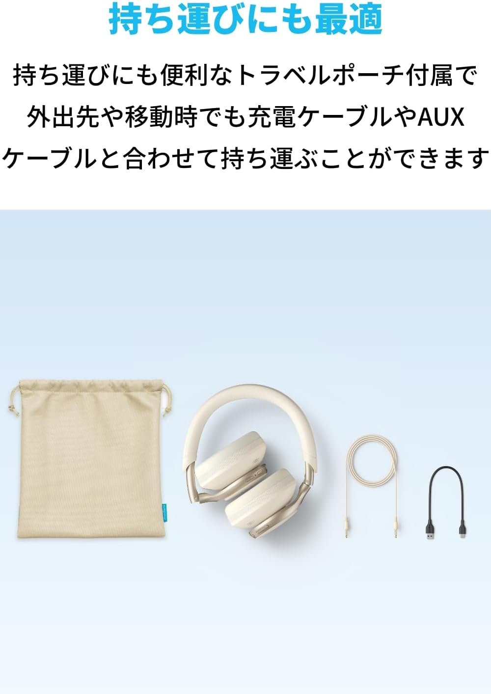 本体、USB-C&USB-Aケーブル、3.5mmAUXケーブル、トラベルポーチ、クイックスタートガイド、安全マニュアル技適マーク認証済み商品