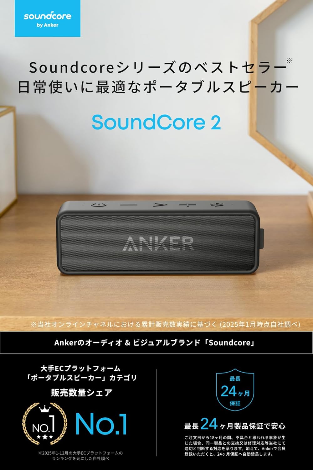 AnkerSoundCore2、USB-C&USB-Cケーブル、取扱説明書、カスタマーサポート技適マーク認証済み商品(周波数帯:2402MHz~2480MHz)