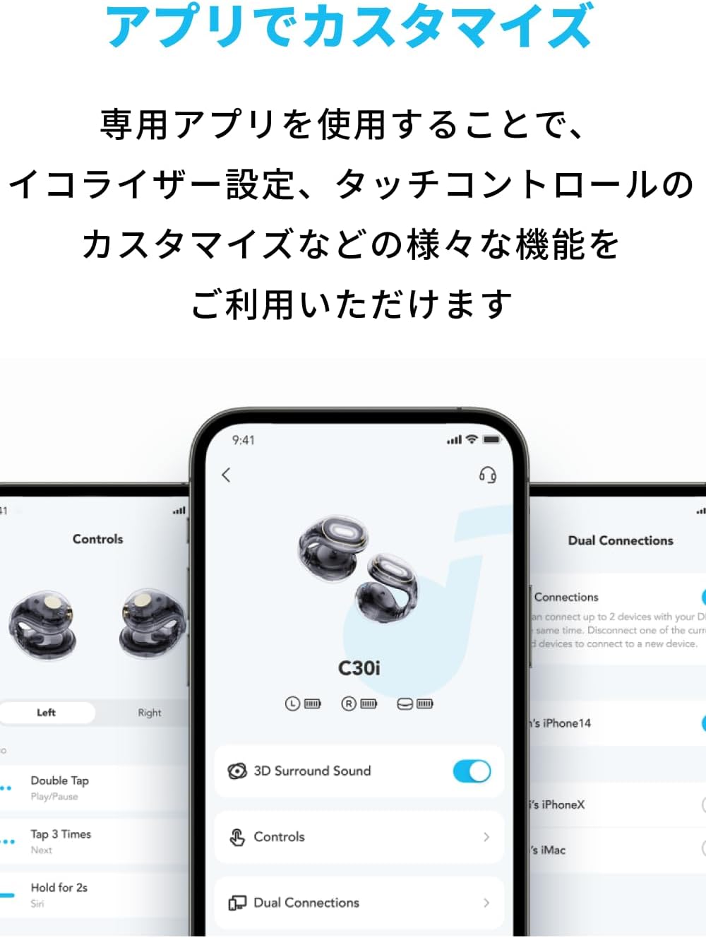 SoundcoreC30i、充電ケース、イヤーカフキャップ(2種、サイズ:M/L)、USB-A&USB-Cケーブル