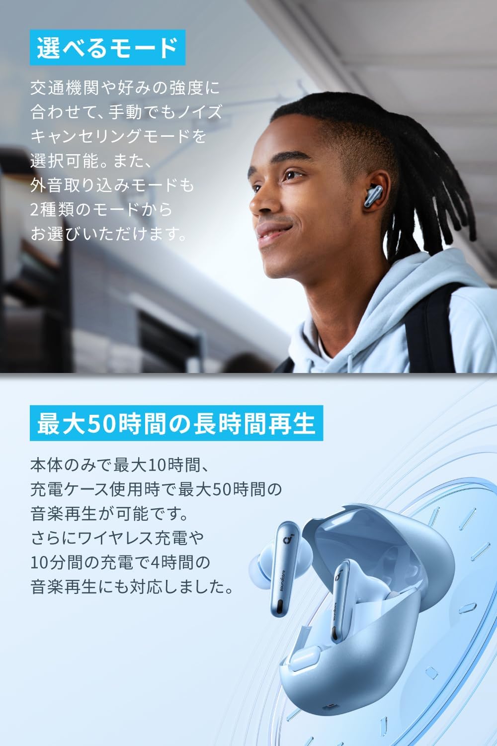 ・通常モード:最大10時間(イヤホン本体のみ)/最大50時間(充電ケース使用時)