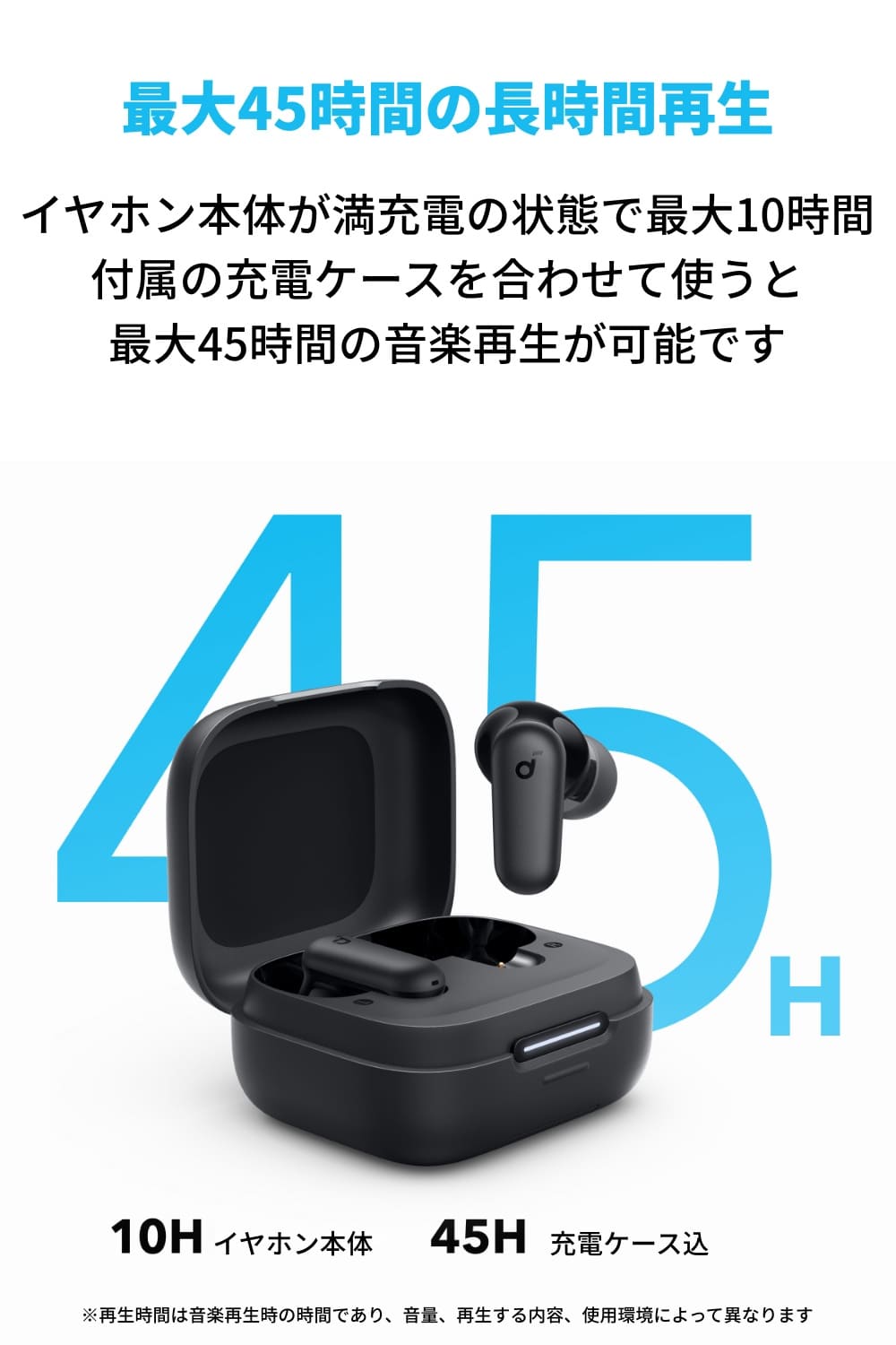 ・通常モード:最大10時間(イヤホン本体のみ)/最大45時間(充電ケース使用時)