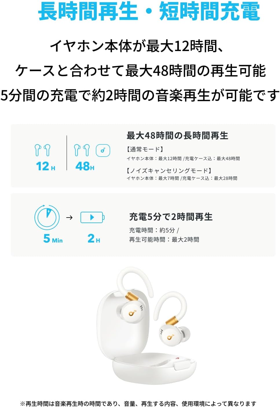 ・通常モード:最大12時間(イヤホン本体のみ)/最大48時間(充電ケース使用時)