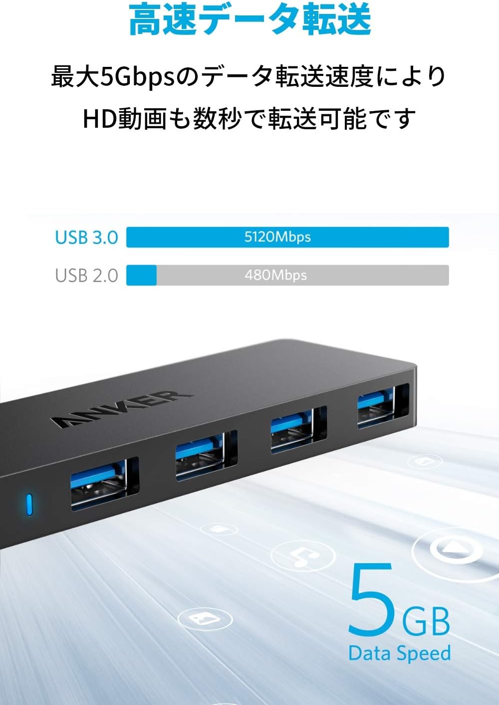 AnkerUSB3.0ウルトラスリム4ポートハブ、取扱説明書、最大24ヶ月保証(※正規販売店からの注文に限り18ヶ月保証の対象となり、Anker会員には+6ヶ月の延長保証が付きます。カスタマーサポート。(※製品パッケージは予告なく変更になる場合がございます。)