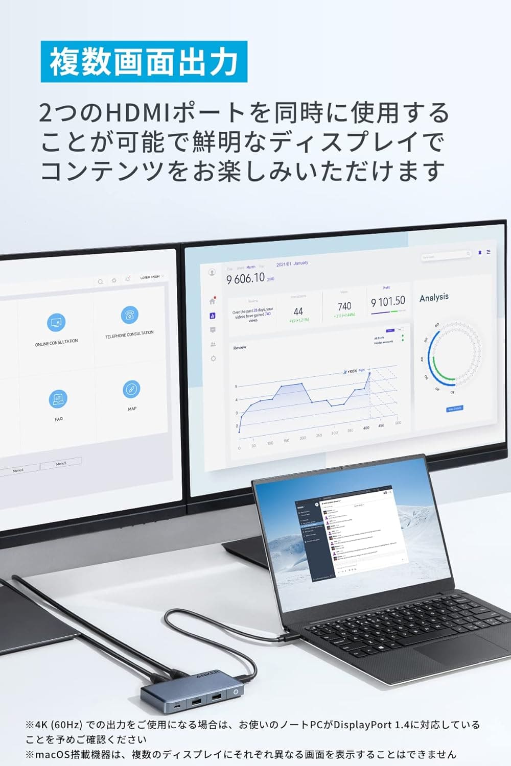 Anker364USB-Cハブ(10-in-1,Dual4KHDMI)、取扱説明書、最大24ヶ月保証(※正規販売店からの注文に限り18ヶ月保証の対象となり、条件付きで+6ヶ月の延長保証が付きます。注文番号が保証書の代わりとなります。)、カスタマーサポート