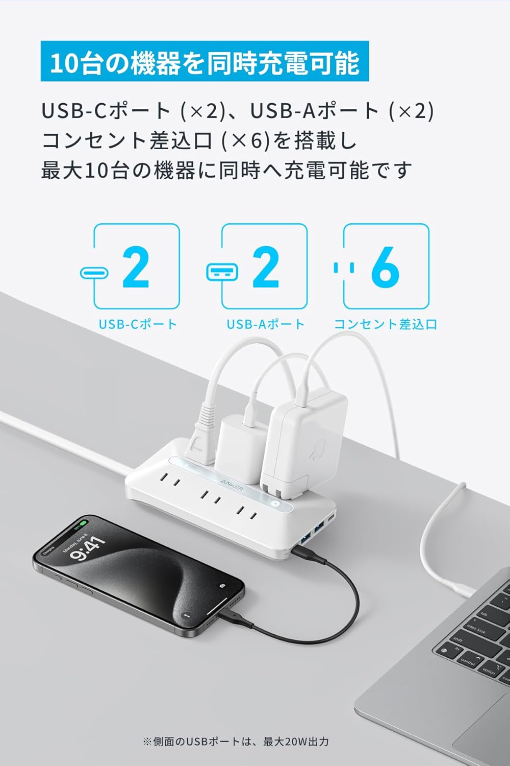 10(USB-C×2、USB-A×2、AC差込口×6)