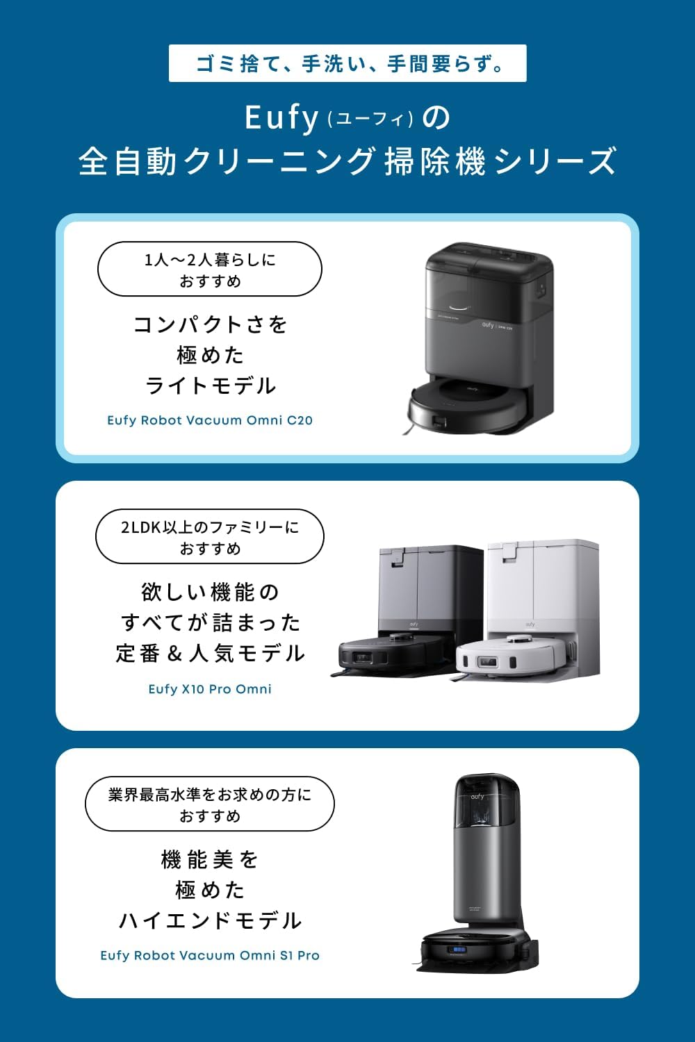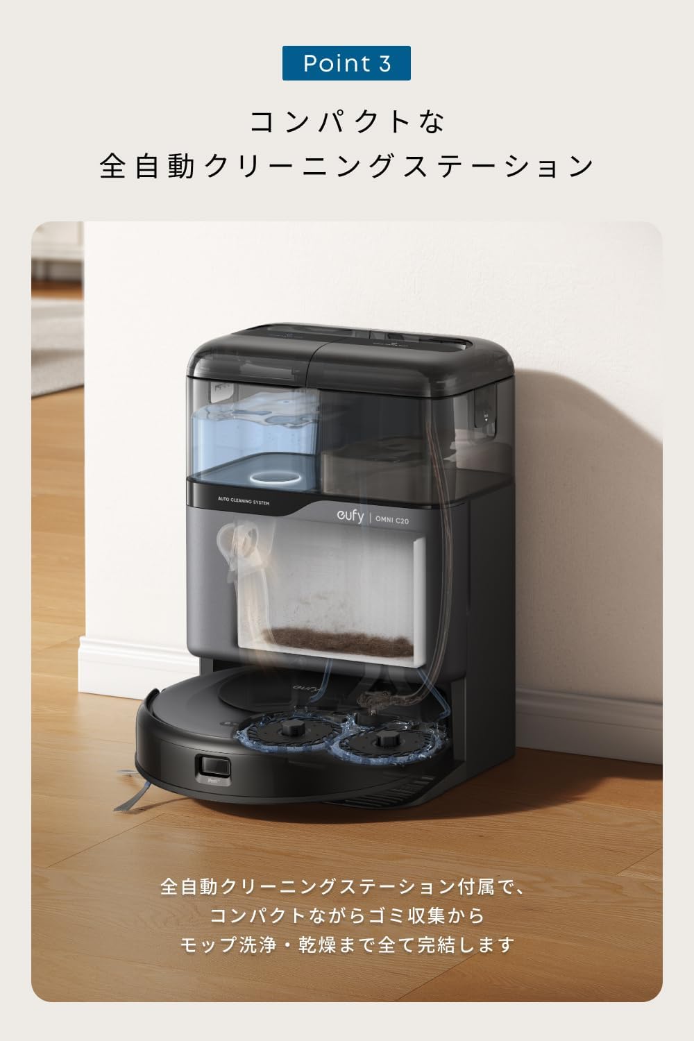 EufyRobotVacuumOmniC20、全自動クリーニングステーション(ダストバッグ付き)、クイックスタートガイド、安全マニュアル