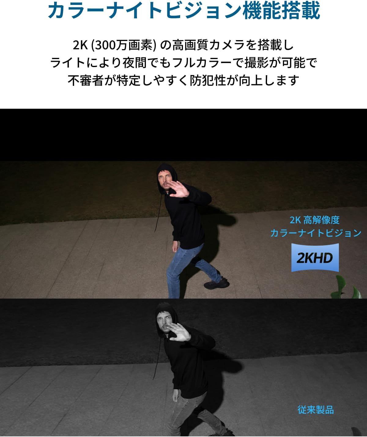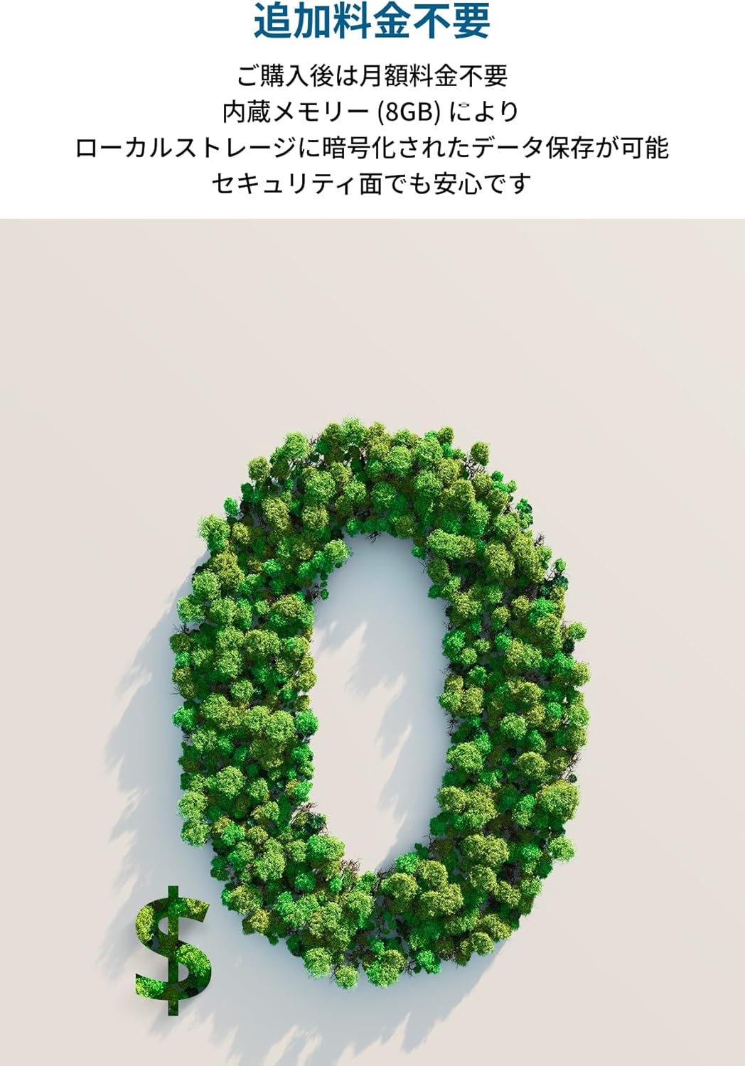 製品本体、USB-CtoUSB-C変換ケーブル(外付けソーラーパネル用)、取り付けプレート、15°下向き取り付けプレート、プレート取り付け用ネジとアンカー、カメラ取り付け用ネジ、クイックスタートガイド、カスタマサポート