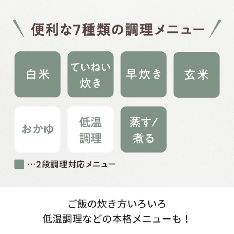 | その他詳細 2 | 付属品:しゃもじ・計量カップ・シリコンミトン(2個)・31品掲載レシピブック |