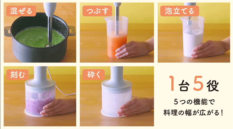 | その他詳細 2 | 機能 ブレンダー(つぶす・混ぜる) チョッパー(刻む・砕く) ホイッパー(泡立てる) 2段階速度調節機能 |