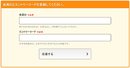 メールアドレスによる認証確認後、Ponta会員ID(15桁)とポイント交換時に記載されているエントリーコード(16桁)を、画面下部にある入力欄に入力し、「応募する」ボタンと押してください。