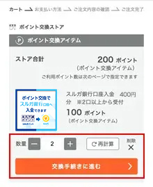 カートに進み、ポイント数にあわせて数量を選び、交換手続きに進みます。
