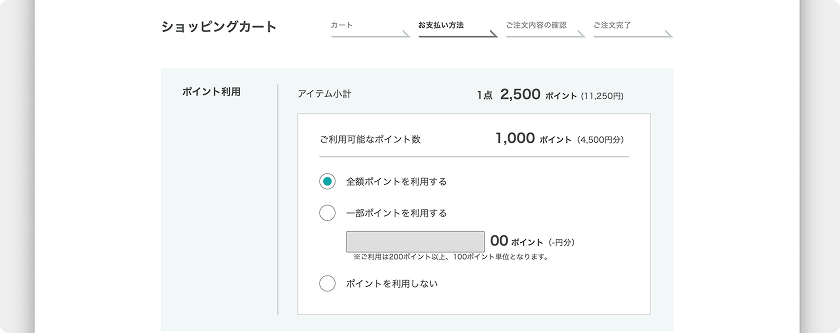 200ポイント以上、100ポイント(=450円相当)単位でお持ちのポイントをお支払いに利用できます。保有ポイントが足りない場合はカード併用払いも可能です。