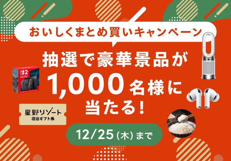 期間中、グルメ※を含む2点以上で合計15,000円(税込)以上ご購入の方から、抽選で1,000名様に豪華景品をプレゼントします。ぜひこのチャンスをお見逃しなく!